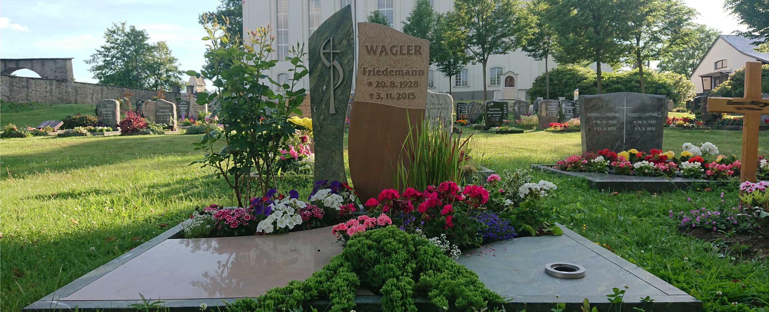 Als Steinmetzfirma mit langjährigen Erfahrungen im Grabmalbereich bieten wir Ihnen unsere Hilfe an. Lassen Sie sich beraten und ein nach Ihren Vorstellungen und der Persönlichkeit des Verstorbenen entsprechendes Grabmal fertigen. Ob in Marmor oder Granit, handwerklich gearbeitet oder hochglanzpoliert, ob als schlichter Urnenstein oder als großes Familiengrab, immer haben Sie mit uns Leute zur Hand, die ihr Handwerk verstehen. Vom ersten Beratungsgespräch bis zum Aufstellen auf dem Friedhof werden wir versuchen allen Ihren Wünschen zu entsprechen und Ihren Angehörigen ein würdiges Grabmal zu gestalten.